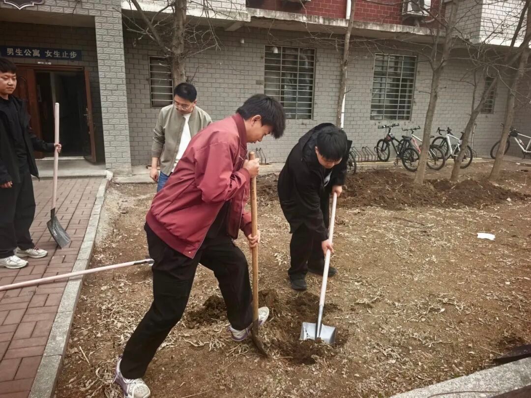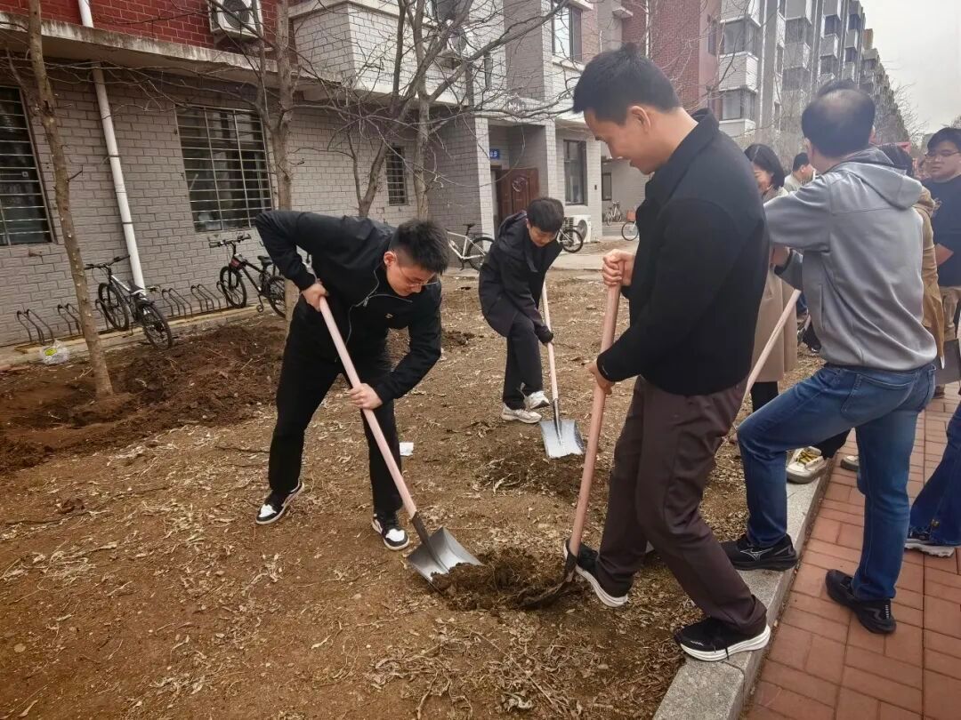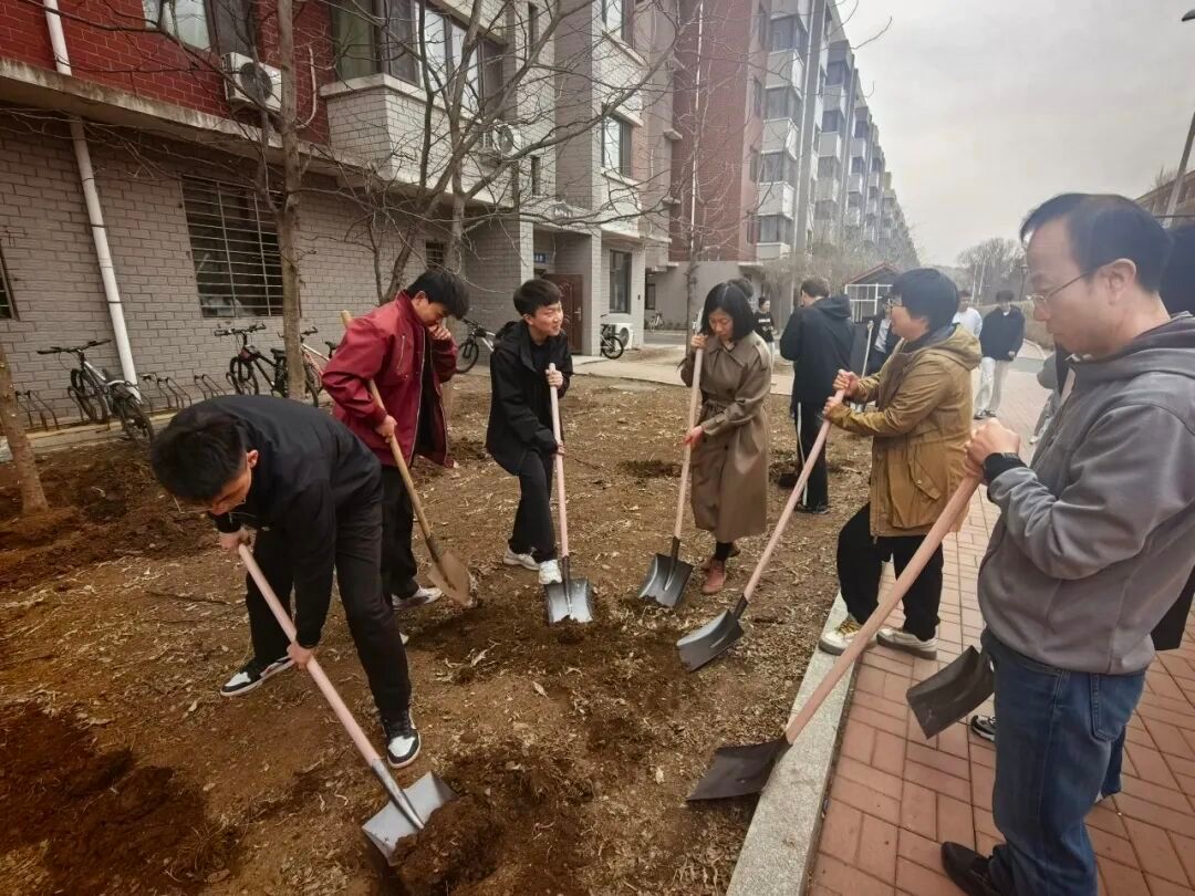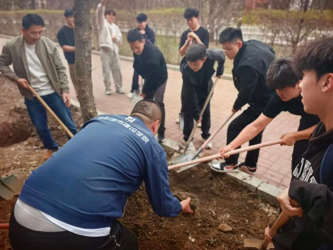 活动现场,师生一同拿起铁锹,投入到热火朝天的劳动中。全体师生热情高涨、分工协作,从挖坑、扶苗、培土到浇水,每个环节都衔接有序、配合默契。大家干劲十足,泥土沾满了裤脚,汗水浸湿了衣背,但每个人的脸上都洋溢着劳动的喜悦。