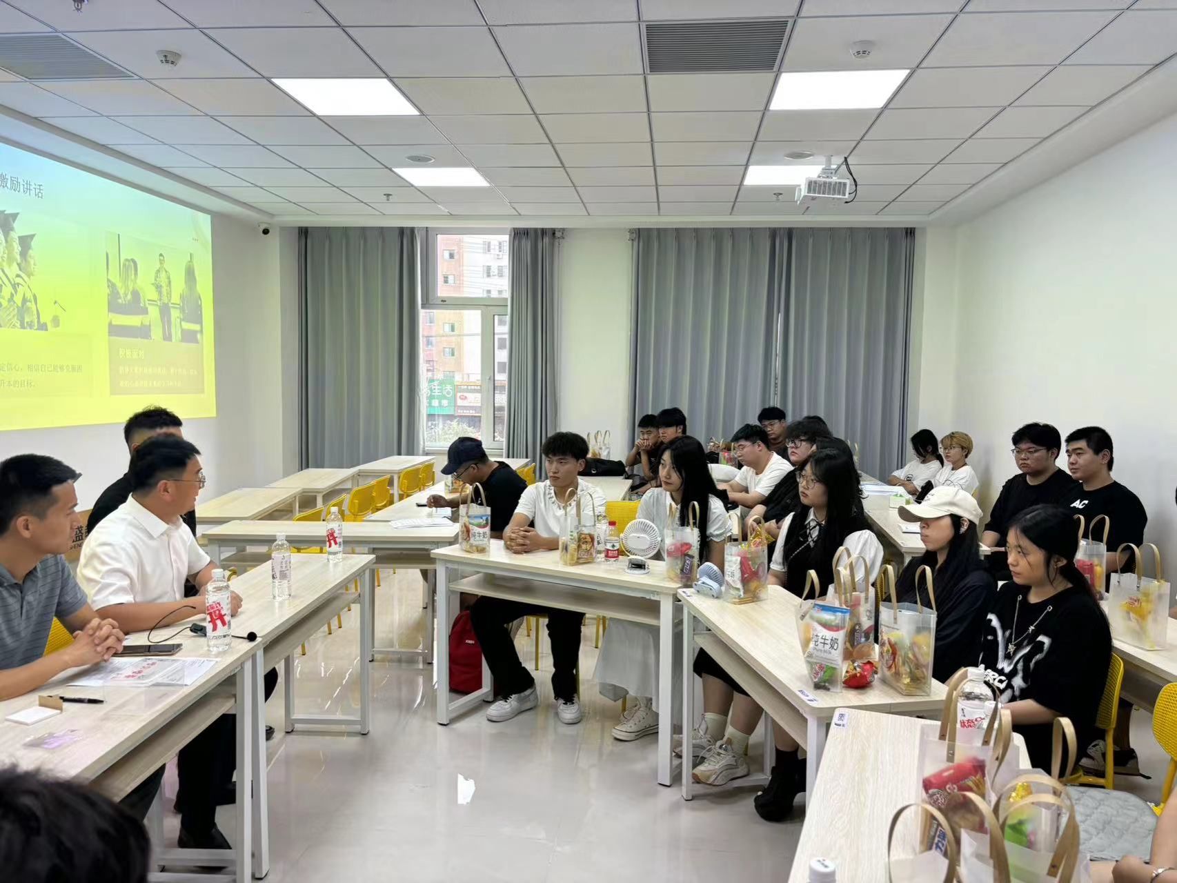 暖心礼包外观简洁大方,上面贴有“金榜题名、成功上岸”的贴纸,寓意着学院对学子们的美好祝愿与殷切期望。礼包内则装有牛奶、士力架、薯片等小零食,旨在关心学生们的日常生活与身心健康,为他们紧张的学习生活增添一份甜蜜与轻松。