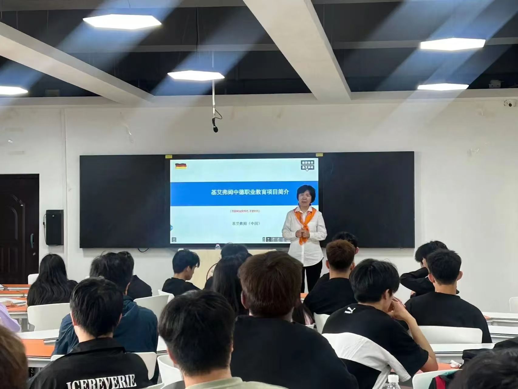 为推进中德职业教育合作办学,深入交流探讨德国“双元制”职业教育模式,推进现代产业技术学院太阳集团高质量发展,5月24日,现代产业技术学院在业精楼A401教室举办德国双元制技工学校合作办学讲座基艾弗姆(辽宁)教育科技有限公司总经理马静华女士做宣讲,基艾弗姆(辽宁)教育科技有限公司副总经理李继敏、现代产业技术学院院长苑泽锴、党总支书记朱帅和校外事处负责人出席了讲座,师生代表参加了本次讲座。