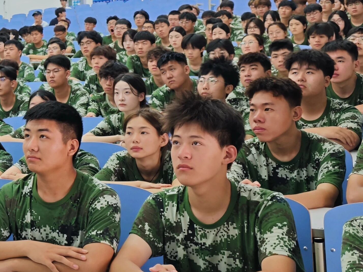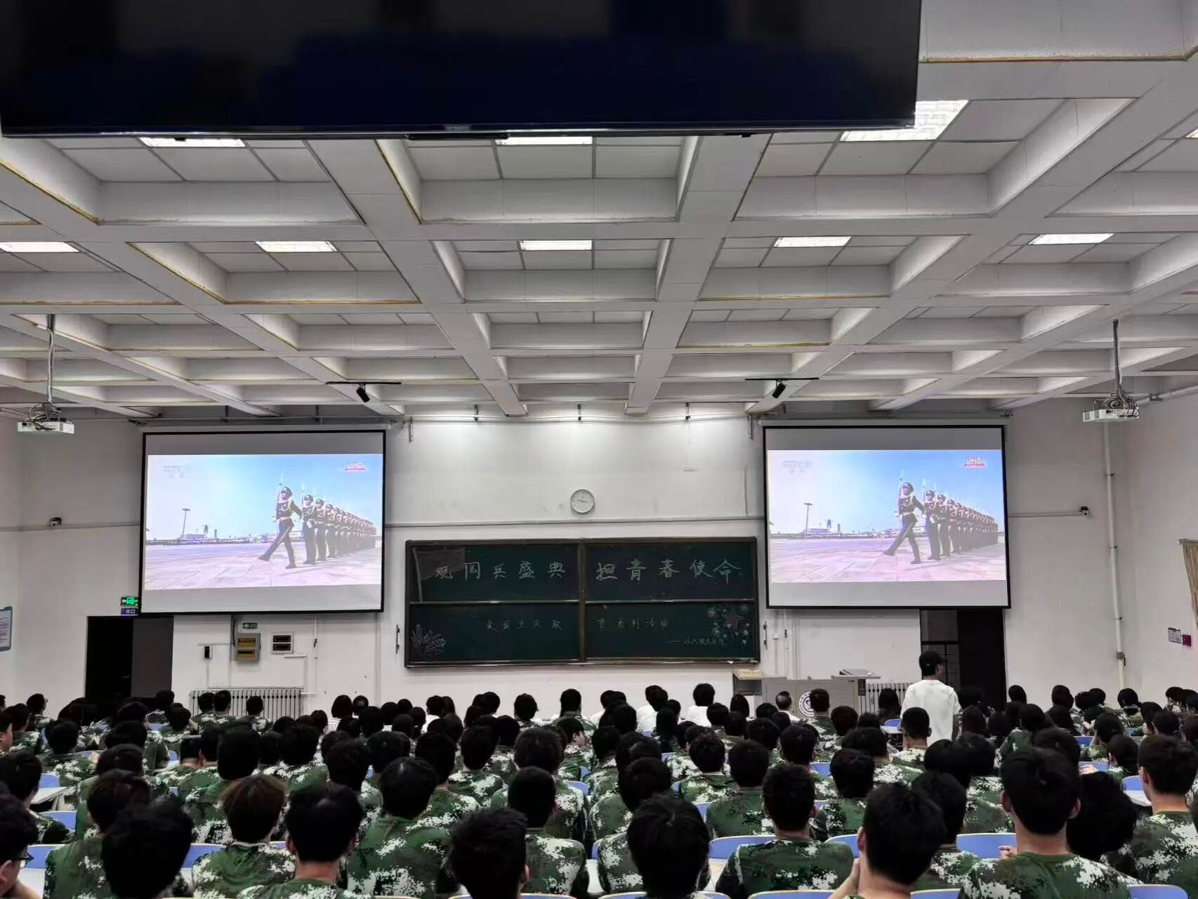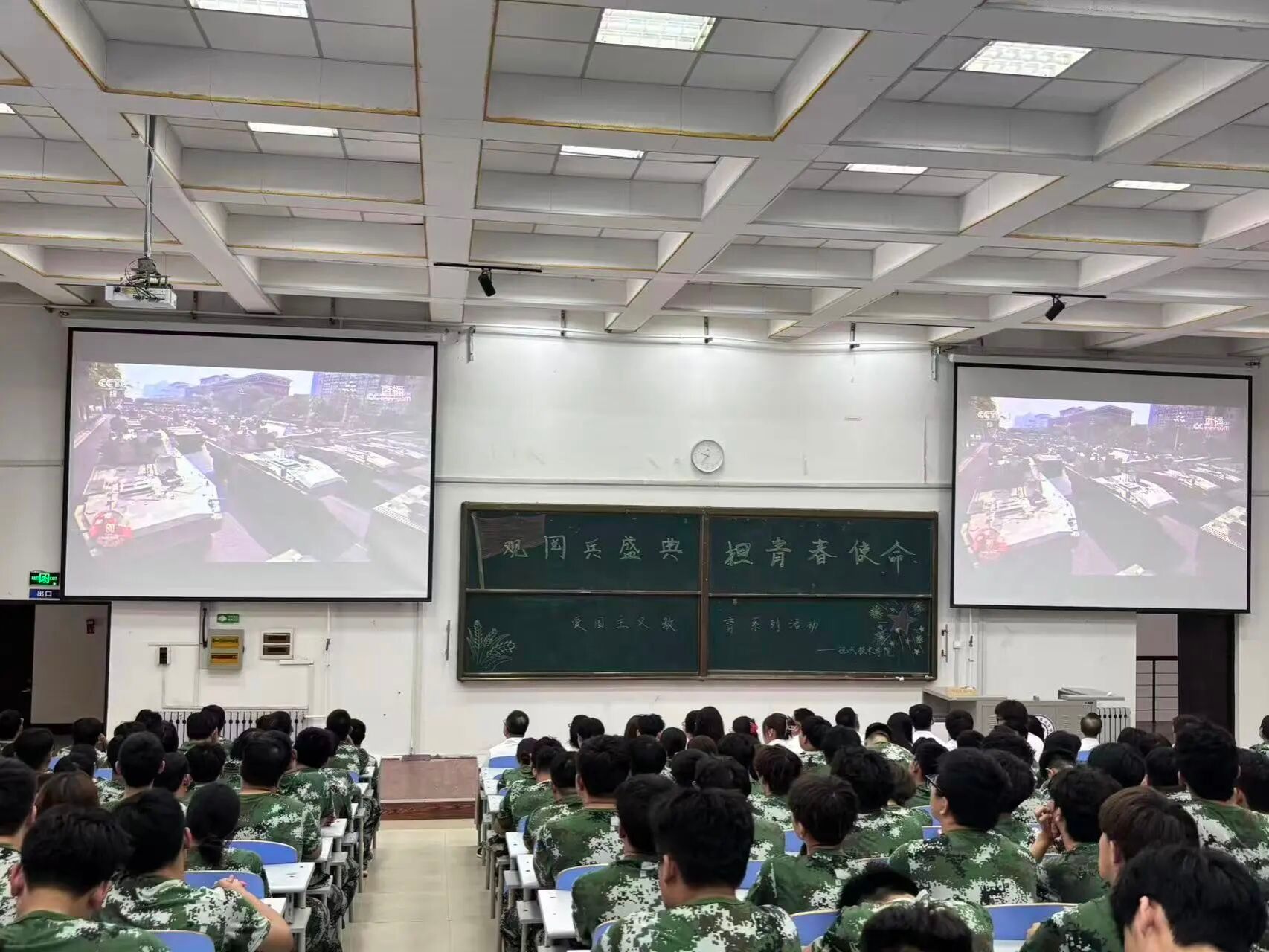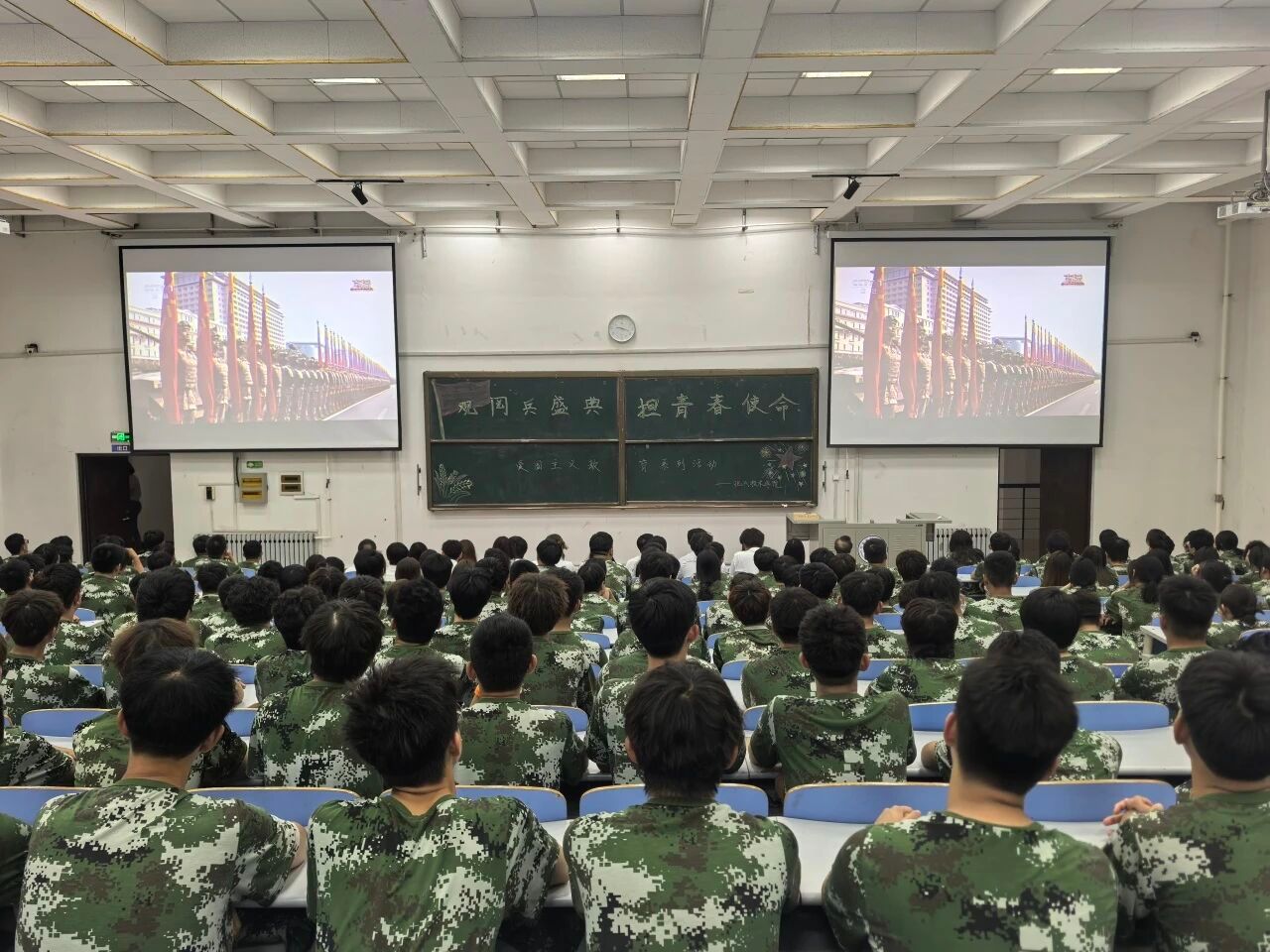 当庄严的国歌声响起时,全体师生起立,齐声高唱国歌,嘹亮的歌声在礼堂内回荡,表达了师生们对祖国最深情的热爱。在观看阅兵仪式时,官兵们整齐划一的步伐、铿锵有力的口号,让在场师生无不为之动容,阵阵掌声不时响起。