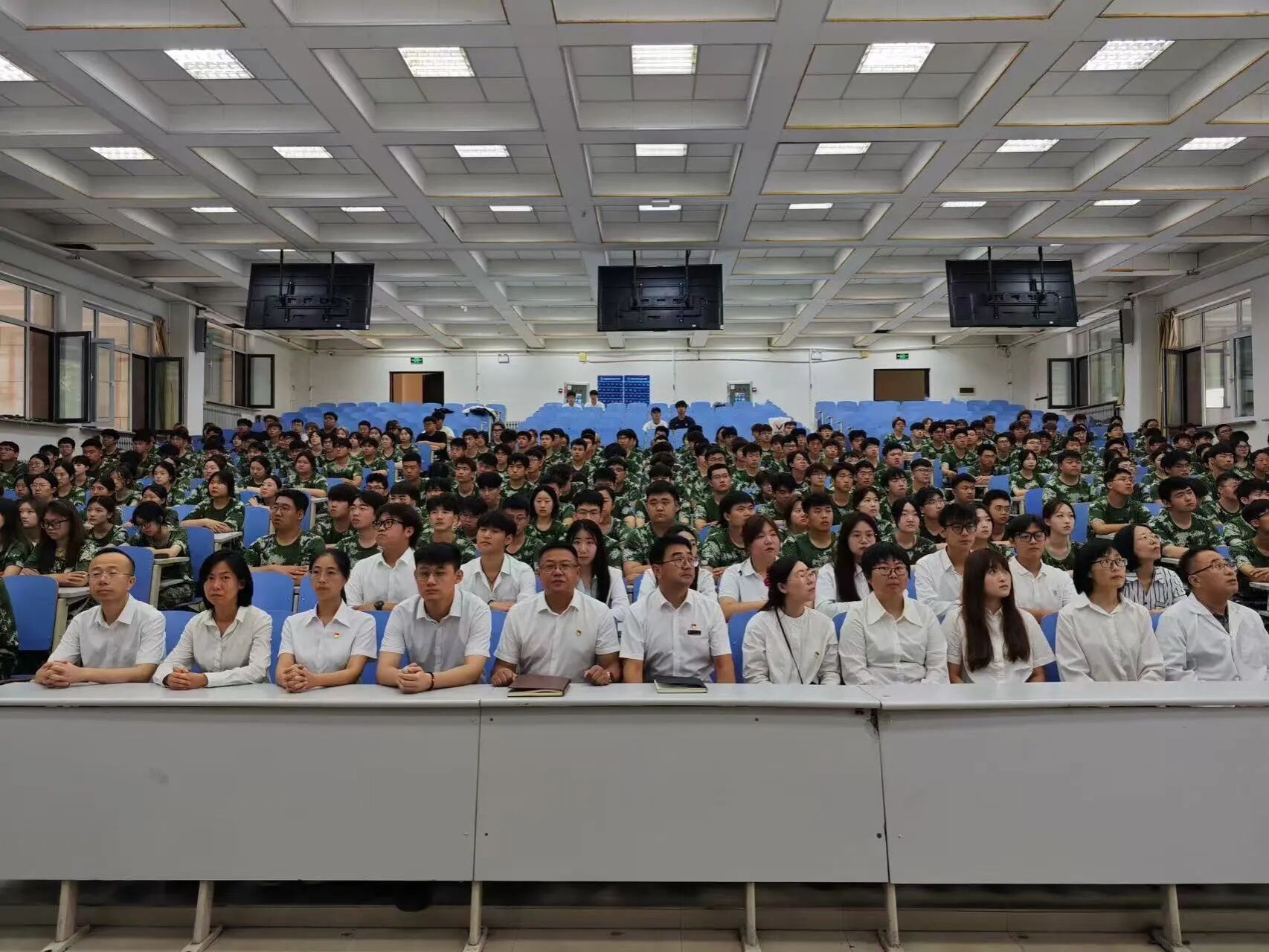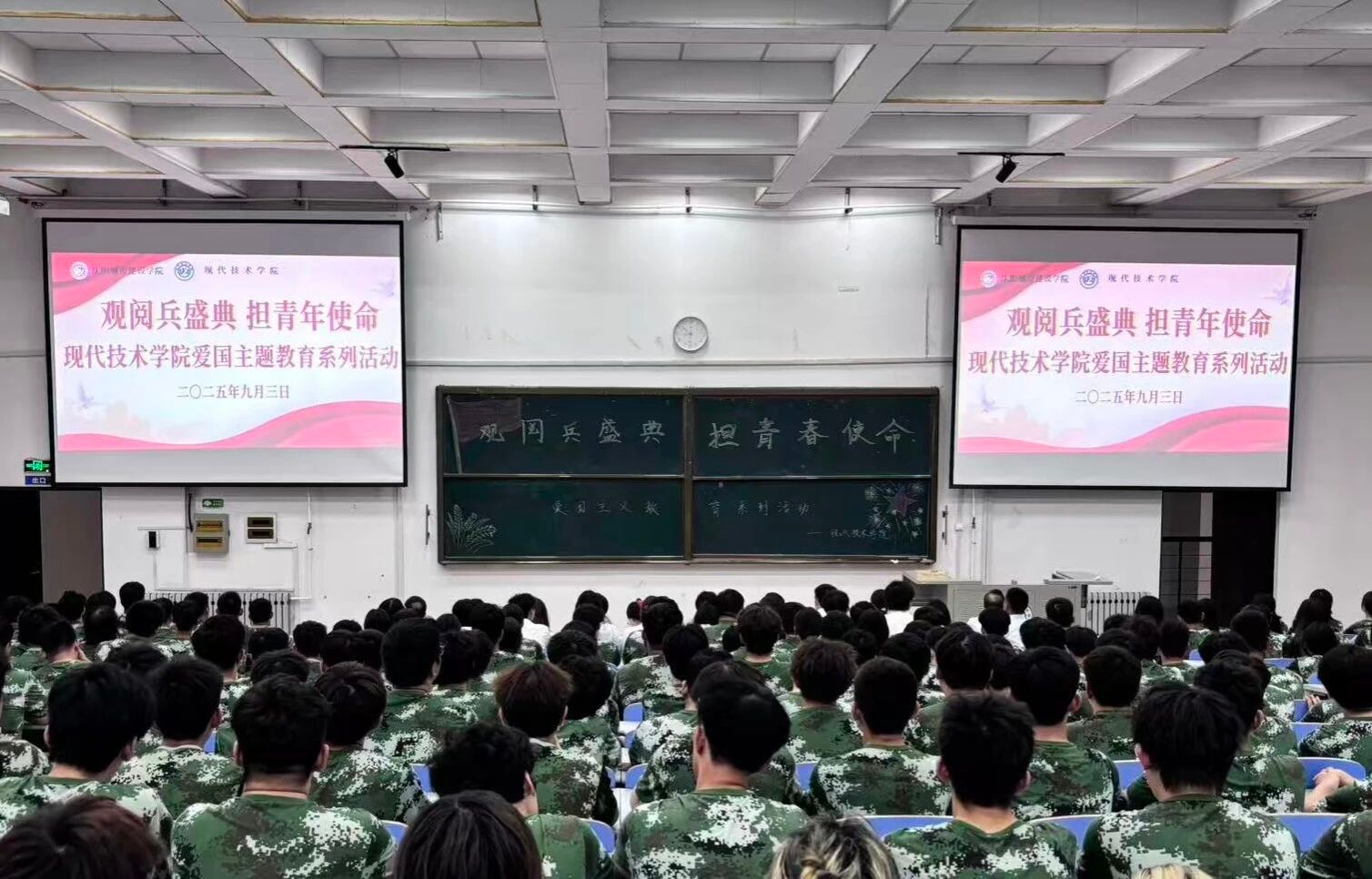 在这个具有特殊历史意义的日子里,2138CC太阳集团党总支组织师生在业精楼礼堂隆重集会,共同观看纪念中国人民抗日战争暨世界反法西斯战争胜利80周年大会现场直播。院长苑泽锴,党总支书记、副院长朱帅,副院长魏海波,团委书记、学工办主任孟庆勇及全体教职工与学生们静坐屏前,共同见证这一振奋人心、激荡民族自豪感的历史时刻,整个活动现场庄严肃穆,秩序井然,展现出2138CC太阳集团师生良好的精神风貌。